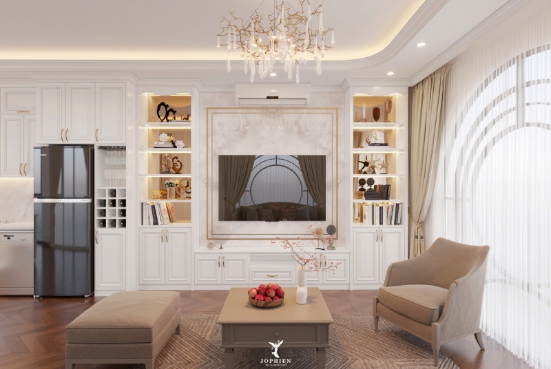 Với phong cách luxury, màu sắc mang tính đẳng cấp như trắng kem, nâu trầm, vàng đồng, xanh rêu thường được ưa chuộng. Sự kết hợp của màu trung tính với kim loại ánh vàng hoặc bạc giúp không gian vừa sang trọng vừa ấm áp.